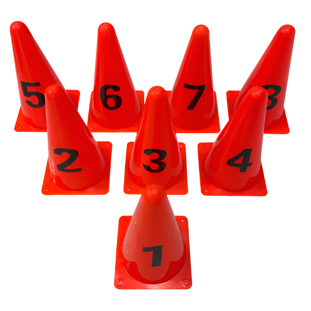 Cada embalagem contém 08 cones numerados, ideais para treinamentos e atividades esportivas.