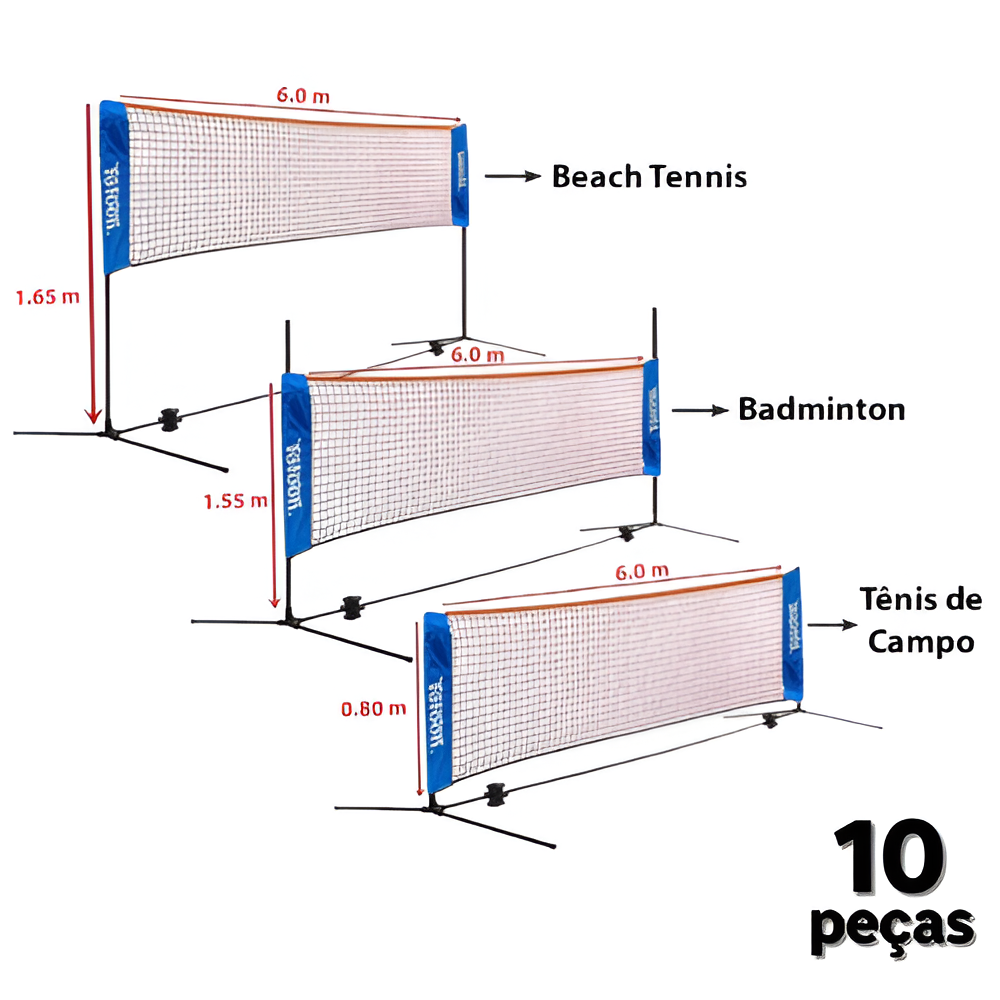 Rede para Tênis/Beach/Badminton 6m de largura com suporte de ferro cromado e 3 níveis de altura: 0,80m, 1,55m e 1,64m.